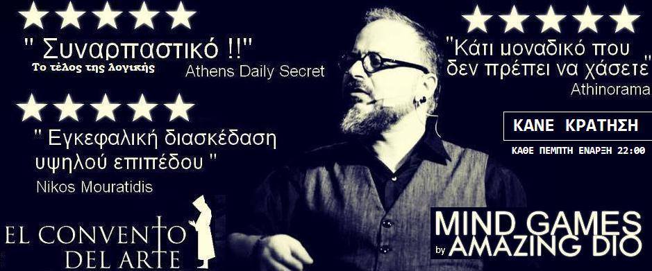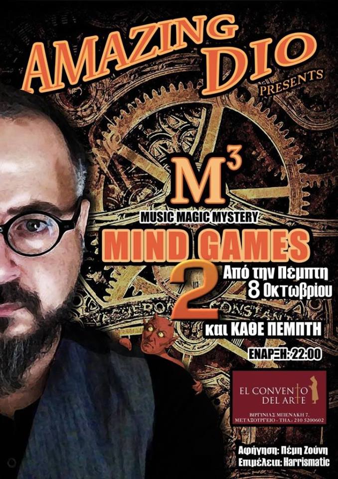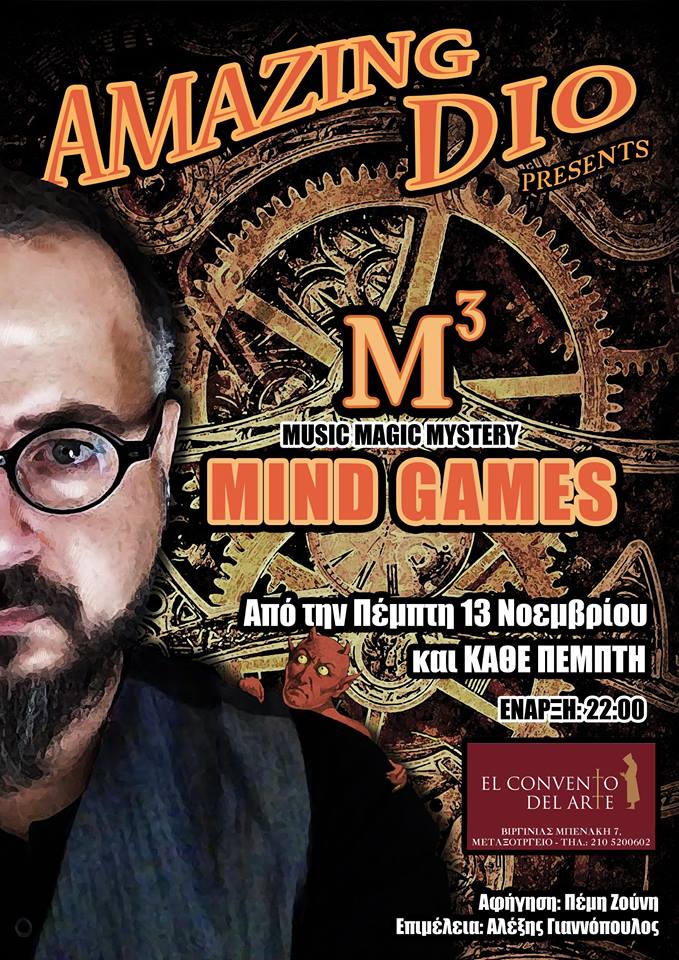 "Κάθε Πέμπτη στην παράσταση "Mind Games" στο El Convento Del Arte, ο Dio παίρνει τη λεπτή γραμμή που χωρίζει το τυχαίο από το προκαθορισμένο (ή το πραγματικό από το φανταστικό) και την κόβει με μια τεράστια ψαλιδιά. Σ' αυτή τη νοητική "απόδραση" θα πρέπει να βοηθήσετε κι εσείς: η παράσταση είναι διαδραστική και η εξέλιξη της βασίζεται στη συμμετοχή του κοινού! Κι όλα αυτά με το υπέρτατο μαγικό κόλπο: το χιούμορ." Πηγή: http://greece.dailysecret.com