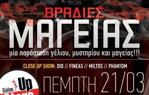 Τον Μάρτιο του 2013 στο Γυάλινο Up Stage κάνει Close up magic στις «Βραδιές Μαγείας» μαζί με τους κορυφαίους μάγους Tristan, Martino, Christian, Benjamin και Alexandros , Fineas, Miltos, Phantom σε μία παράσταση γέλιου και μυστηρίου μέσα απ' την τέχνη της μαγείας.