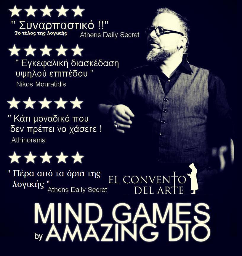 "Κάθε Πέμπτη στην παράσταση "Mind Games" στο El Convento Del Arte, ο Dio παίρνει τη λεπτή γραμμή που χωρίζει το τυχαίο από το προκαθορισμένο (ή το πραγματικό από το φανταστικό) και την κόβει με μια τεράστια ψαλιδιά. Σ' αυτή τη νοητική "απόδραση" θα πρέπει να βοηθήσετε κι εσείς: η παράσταση είναι διαδραστική και η εξέλιξη της βασίζεται στη συμμετοχή του κοινού! Κι όλα αυτά με το υπέρτατο μαγικό κόλπο: το χιούμορ."